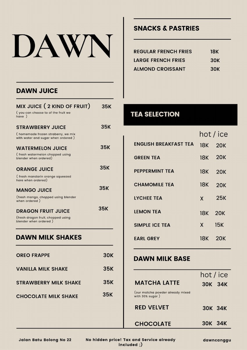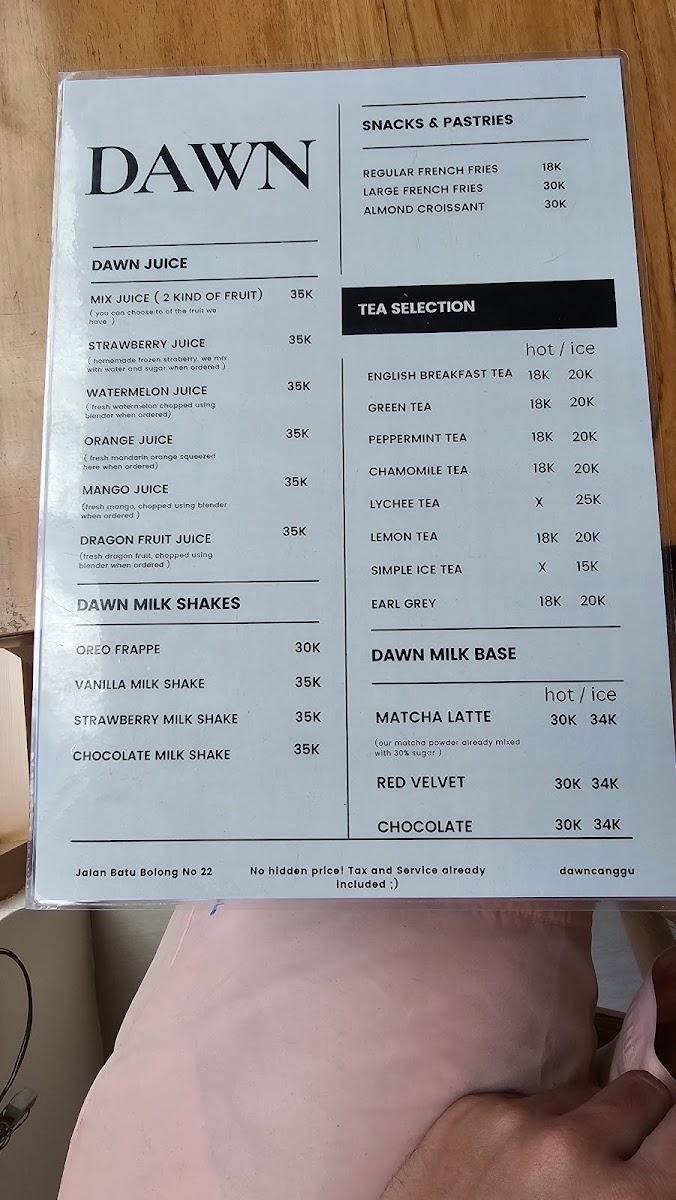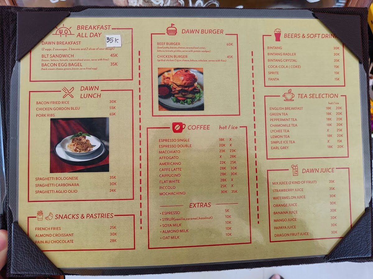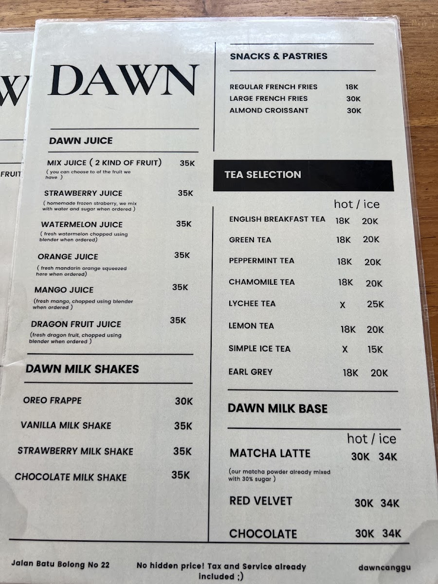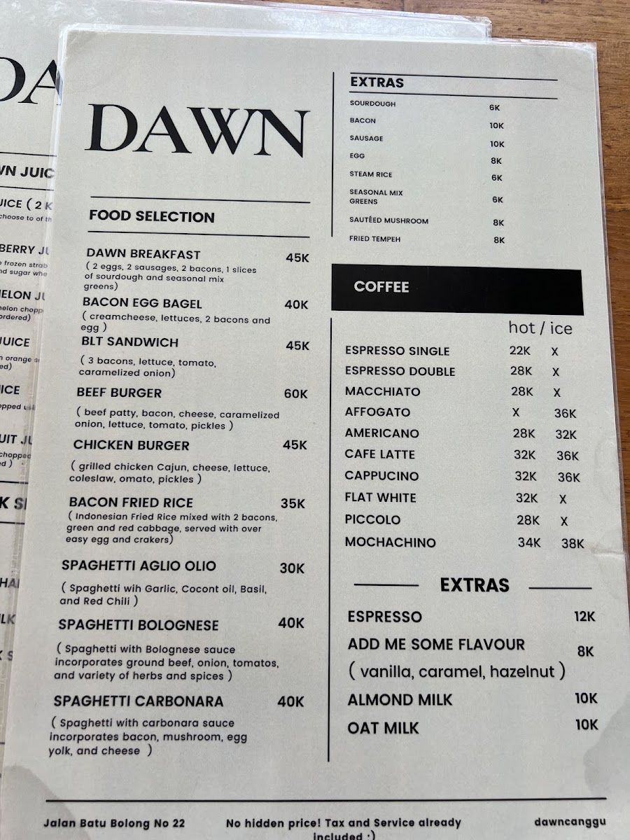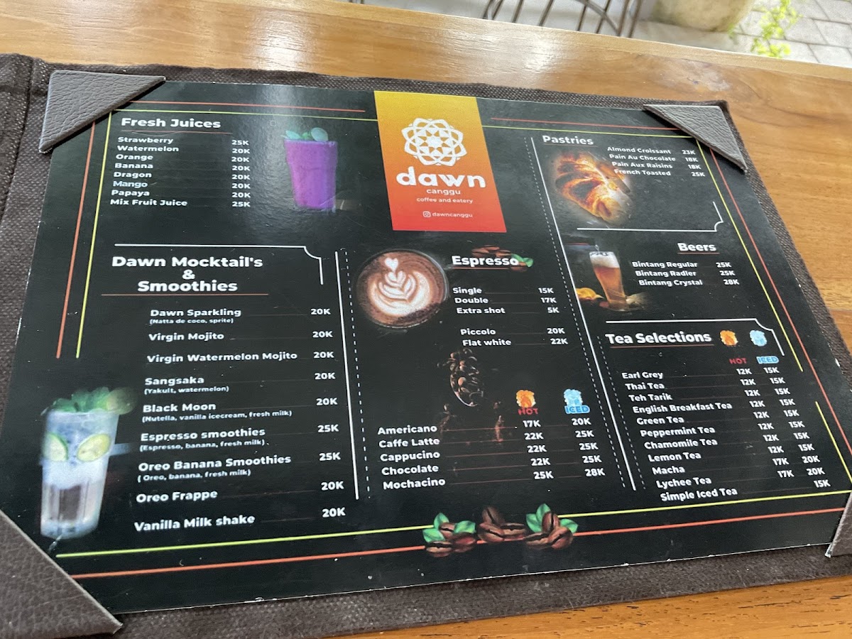 “ I had a nice breakfast at Dawn Coffee after pilates class. Their price is such a steal!! The big breakfast was hearty, and the watermelon juice was refreshing. The almond croissant was good, though I wish it had been a bit crispier. Overall, a pleasant indoor with air-conditioning for breakfast on Batu Bolong (Canggu) main road. ”